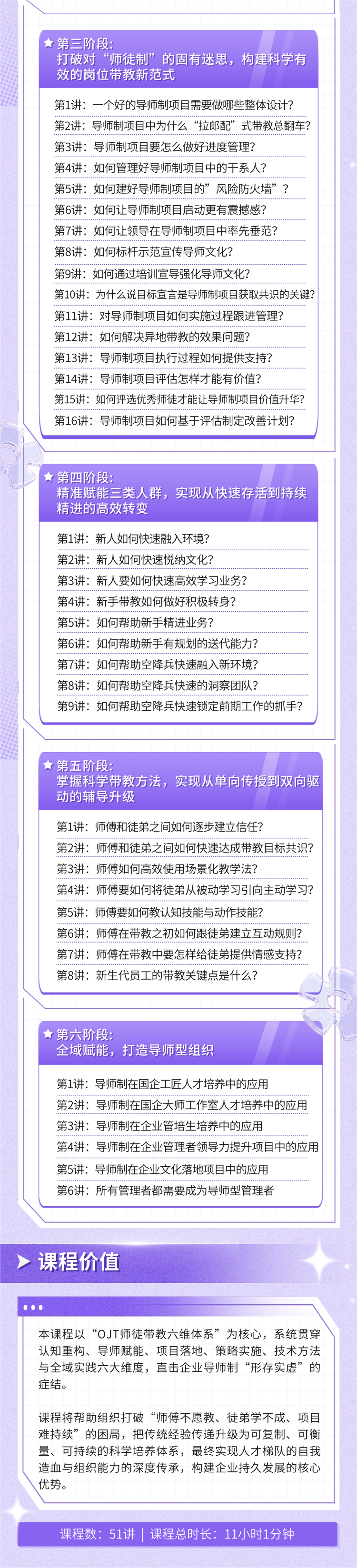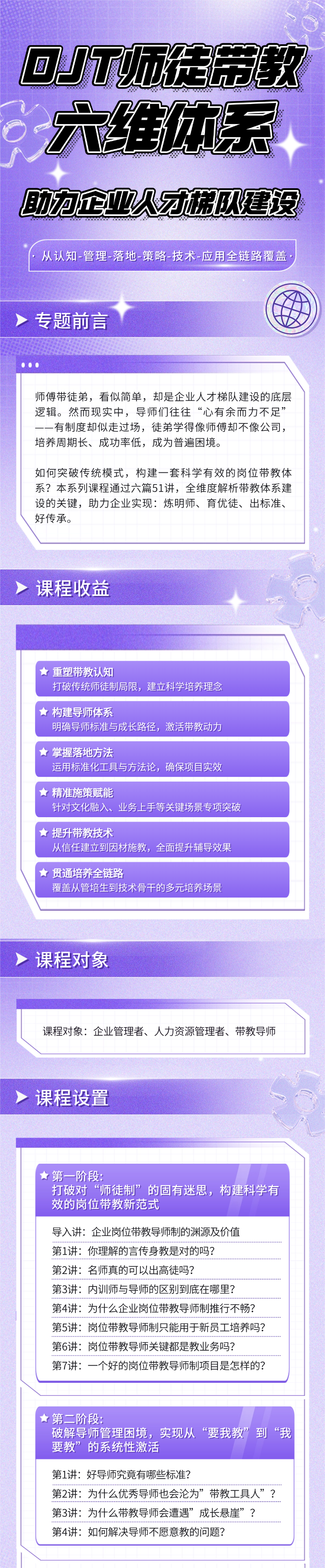 《OJT 师徒带教六维体系》课程重磅来袭!它从认知、管理、落地、策略、技术、应用全链路覆盖,通过六篇 51 讲,重塑你对带教的认知,帮你构建导师体系、掌握落地方法、精准施策赋能、提升带教技术、贯通培养全链路。无论是企业管理者、人力资源管理者,还是带教导师,都能在这套体系中找到破局之道 —— 炼明师、育优徒、出标准、好传承,助力企业打造人才梯队建设的核心竞争力,实现组织能力的深度传承与持久发展。