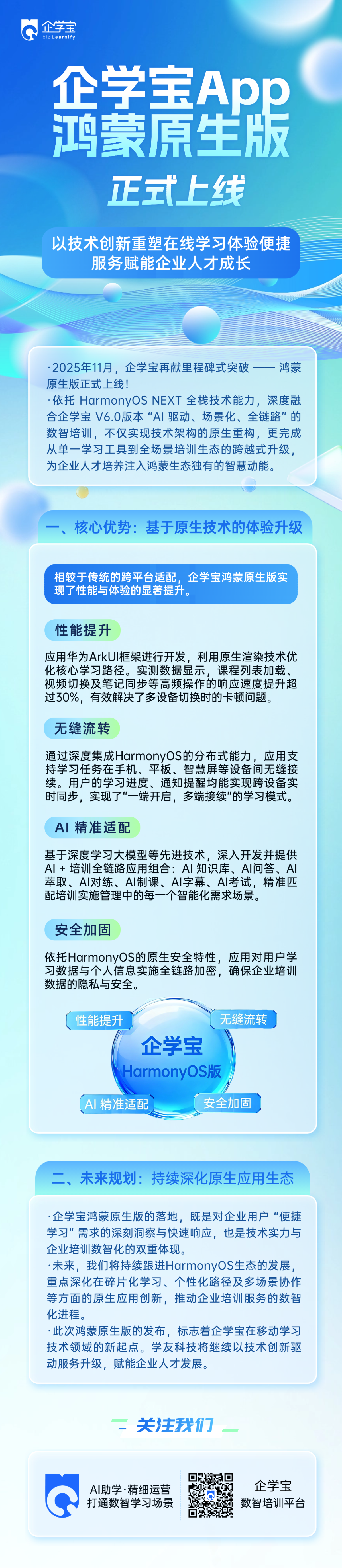 企学宝 App 鸿蒙原生版正式上线!依托 HarmonyOS NEXT 全栈技术能力,深度融合企学宝 V6.0“AI 驱动、场景化、全链路” 的数智培训优势,它不仅实现技术架构原生重构,更完成从单一学习工具到全场景培训生态的跨越式升级。性能提升超 30%、多设备无缝流转、AI 全链路精准适配、数据安全全链路加密…… 一系列核心优势,将为企业人才培养注入鸿蒙生态独有的智慧动能,重新定义便捷高效的在线学习体验。