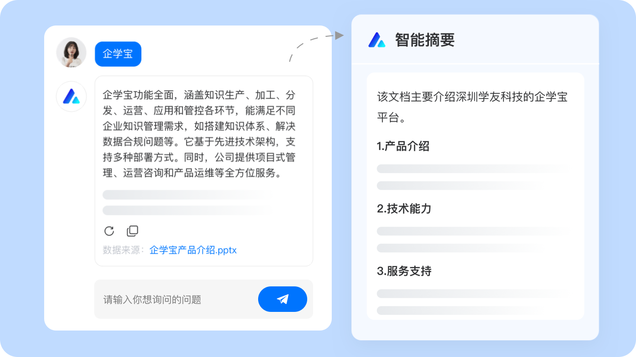AI可协助企业构建智能知识库,利用RAG等技术对内部会议纪要、流程文档、专家经验等非结构化内容进行系统梳理与存储。员工通过语音或文字即可快速检索所需知识。例如,学友科技将“启雀”智能知识库接入企学宝,激活企业内部知识的流动与复用,并实现知识资产的统一管理与权限精细管控,提升知识复用效率。